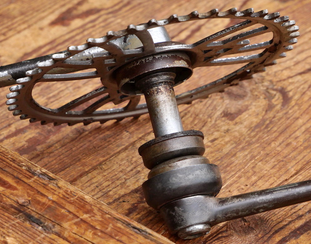 Tretlager VICTORIA für Tourenrad, orig. 30er J., verchromt, Glockenlager, Kettenblatt 46 Zähne, Kurbellänge 150 mm, inkl. komplettem Lager, Schalendurchmesser 40 mm, gebraucht, Lager o.k, Zustand siehe Bilder.