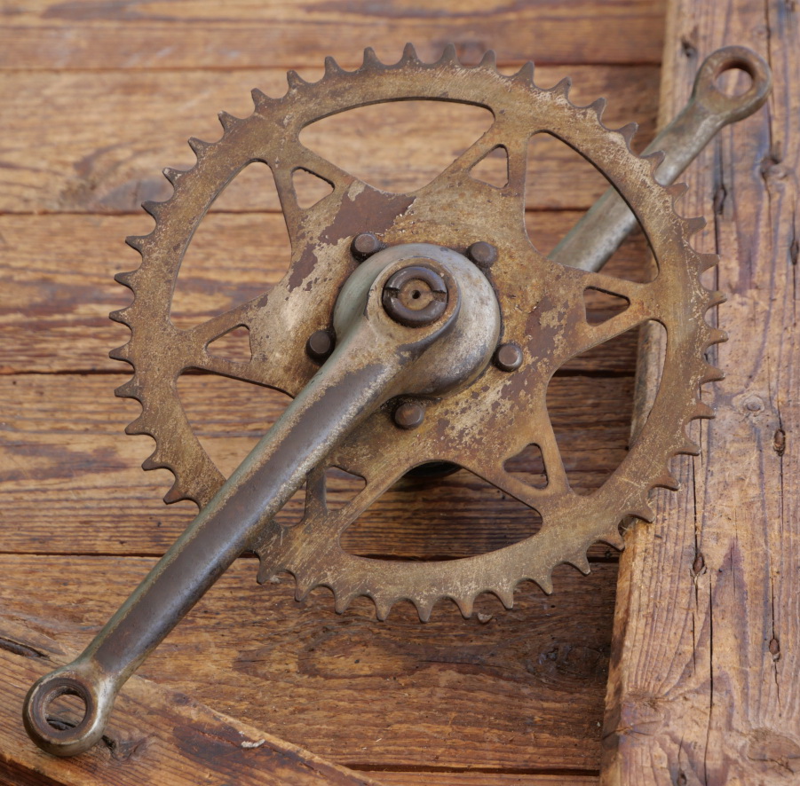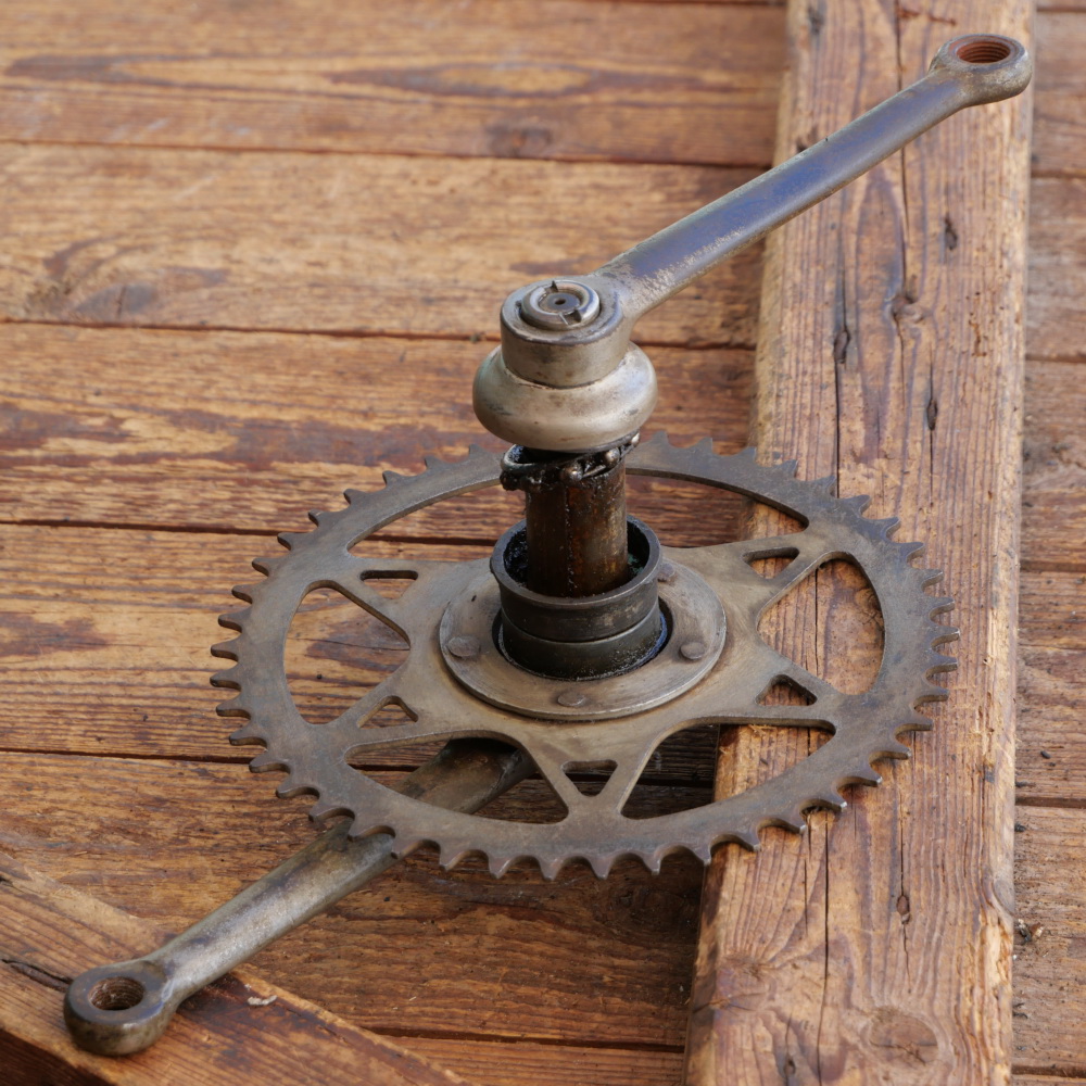 Tretlager für Tourenrad, orig. 10er/20er J., vernickelt, Glockenlager, Kettenblatt 46 Zähne, Kurbellänge 165 mm, inkl. komplettem Lager, Schalendurchmesser 40 mm, gebraucht mit Patina, Zustand siehe Bilder.
