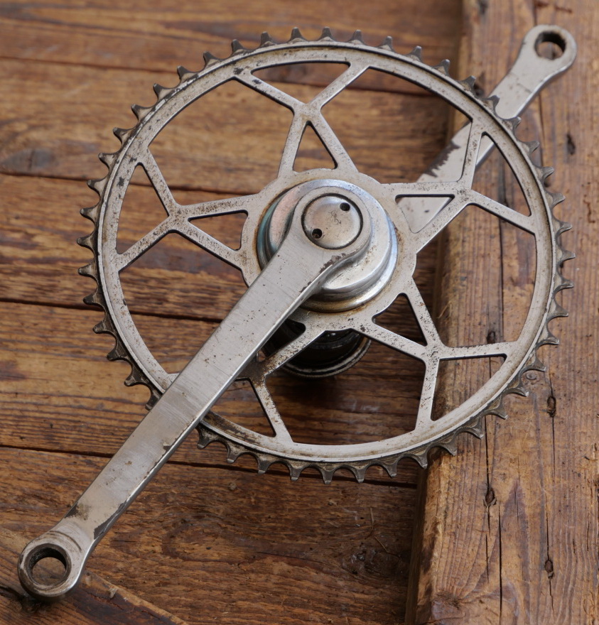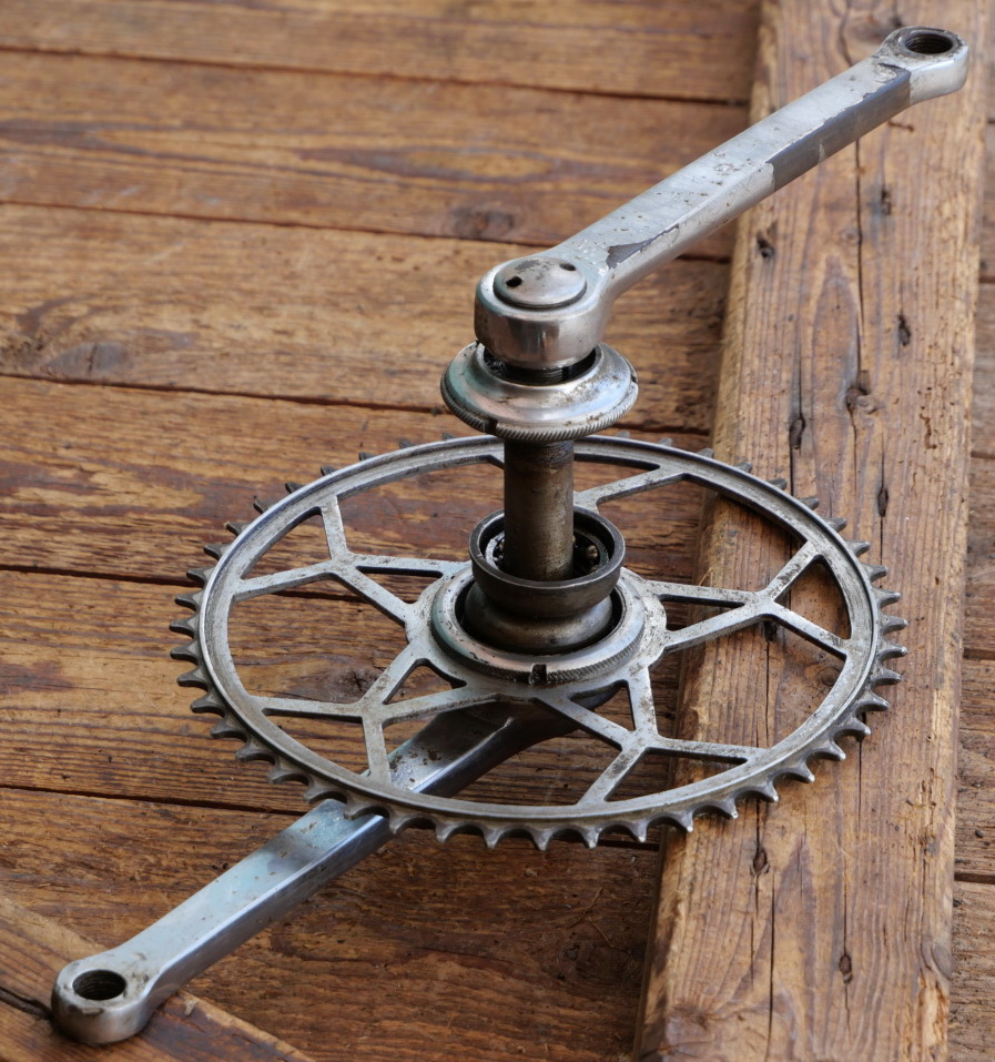 Tretlager für Tourenrad, orig. 30er J., verchromt, Glockenlager, Kettenblatt 48 Zähne, Kurbellänge 175 mm, inkl. komplettem Lager, Schalendurchmesser 44 mm, gebraucht mit Patina, Zustand siehe Bilder.