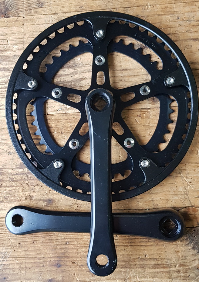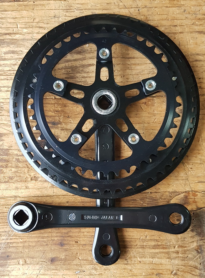 Kurbelgarnitur 2-fach, "SUGINO (Japan) ", schwarz, für Tretlager mit Vierkantachse, Kurbel 170 mm, Kettenblatt 52/42 Zähne, LK: 110 mm, Pedalgewinde standard 9/16". Kurbeln, Kettenräder und Kettenschutzring aus stabilem Aluminium, orig. aus 80/90er Jahre Lagerbestand ! (lagerungsbedingt kleine Lackabplatzer möglich). Ideal für Rennräder/Randonneure im klassischen Style.