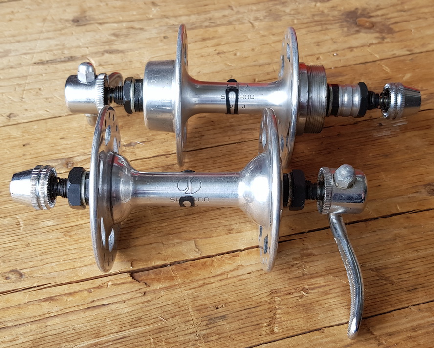 Nabensatz SHIMANO Hochflansch, pass. für 70er Jahre Rennräder mit 5-fach Kranz, 36 Loch, 100 u. 121 mm Einbaumaß, mit orig. Schnellspanner, rare alte Neuware !