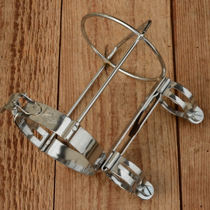 Halter für Trinkflasche "REG", verchromt, incl. 2 Schellen u. Spannvorrichtung, rares Originalteil der der 50/60er Jahre. Ideal für sehr hochwertige Rennräder aus dieser Zeit.