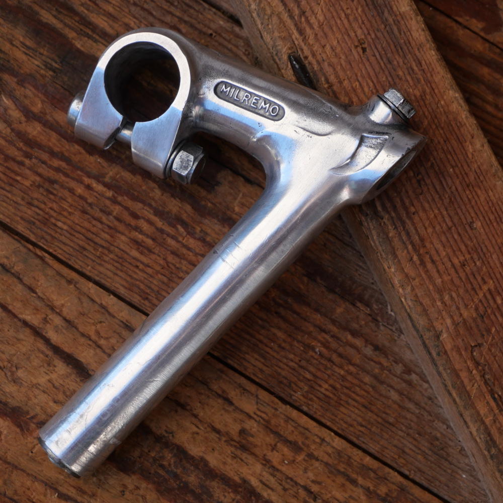 Vorbau Fahrrad MILREMO, original 50er/60er Jahre, für Rennrad, Alu, Länge 75 mm, Schafthöhe ca. 105 mm, Durchmesser Klemmung 25,4 mm, gebraucht mit schöner Patina, Zustand gemäß Fotos.