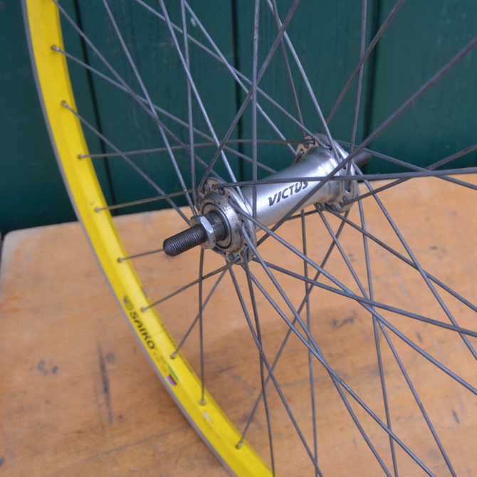 Laufrad MTB vorn 26 Zoll, Felge "Saiko" (Polen) gelb, 559-16, Hohlkammerprofil, Breite 24 mm, Einbaumaß 100 mm, Ventilbohrung 8,5 mm, Speichen verzinkt, 36-Loch, NOS