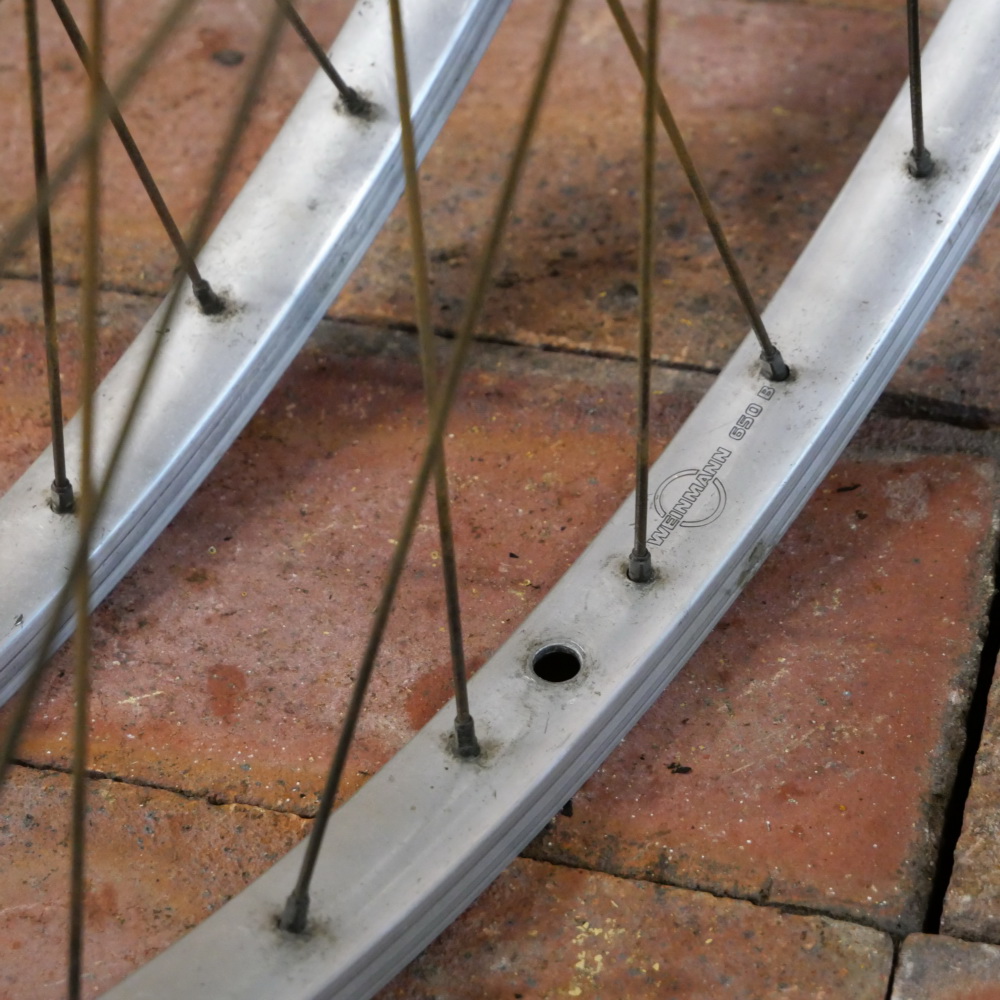 Laufradsatz 26 Zoll (650B), 50er/60er J., für Sportrad, Felgen: Weinmann Alu, Breite 28mm, Naben: BERTIN Alu, mit Freilauf-Schraubkranz 18 Zähne, Einbaumaße: ca. 94/113 mm, 2mm Chrom-Speichen, gebraucht mit Patina, Zustand gemäß Fotos