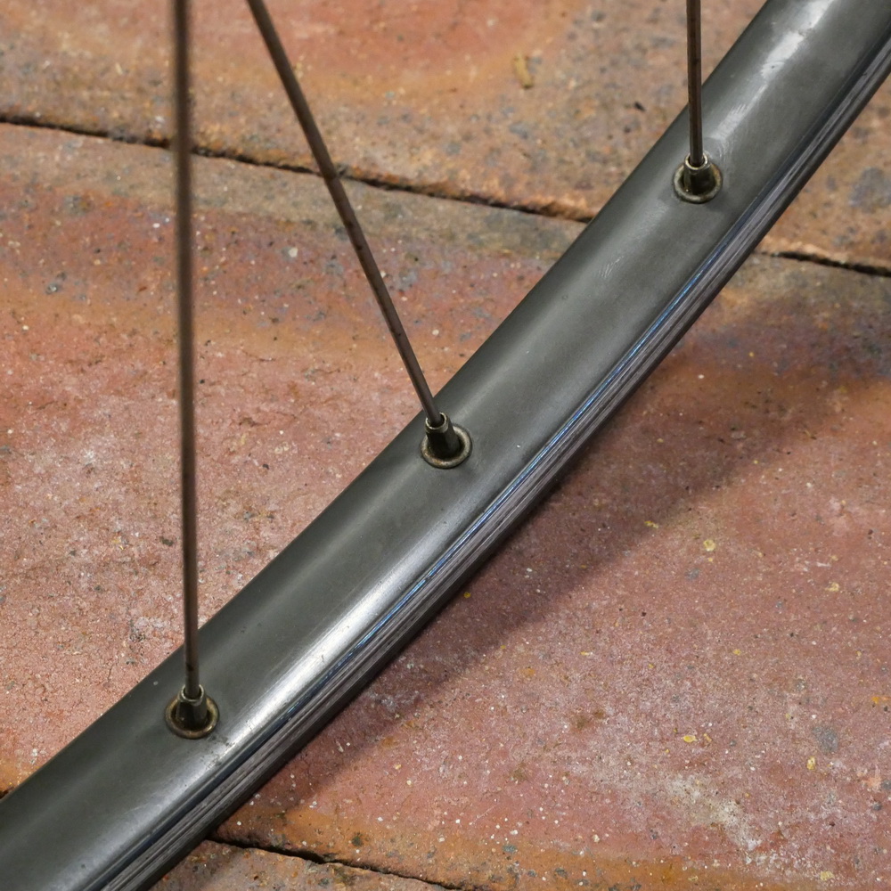 Vorderrad 28 Zoll (622), für Rennrad mit Drahtreifen, 70er/80er Jahre, Hohlkammer, braun eloxiert, Breite ca. 20mm, 36 Loch, 2mm Speichen rostfrei, Nabe "Campagnolo Record", Einbaumaß ca. 100mm, gebraucht, guter Zustand gemäß Fotos