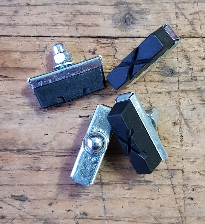 Bremsklötze für Sport und Tourenradklassiker m. Aluminium-oder Stahlfelgen, orig. Satz 4 Stück, kompl. Gummi mit Schuh und Hutmutter gem. Bild.
