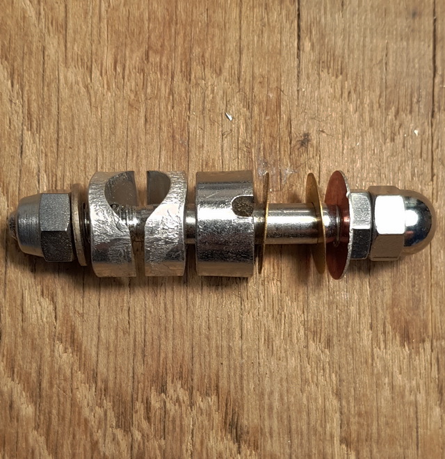 Aufnahmestück "Weinmann" für hintere Bremse am runden Steg, Rennrad/Randonneur, verchromt mit Weinmann U-Scheibe, orig. 50-70er Jahre. Rare, alte Neuware, passt auch für div. andere Bremsenhersteller.